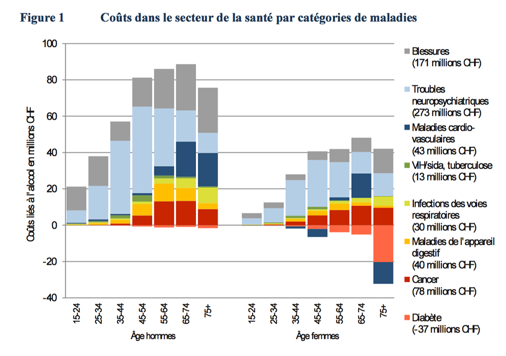 Costs linked directly to alcohol abuse, for example healthcare and expenses linked to crimes committed while under the influence, are 20 percent of the total bill, with healthcare costs alone accounting fo CHF613 million.