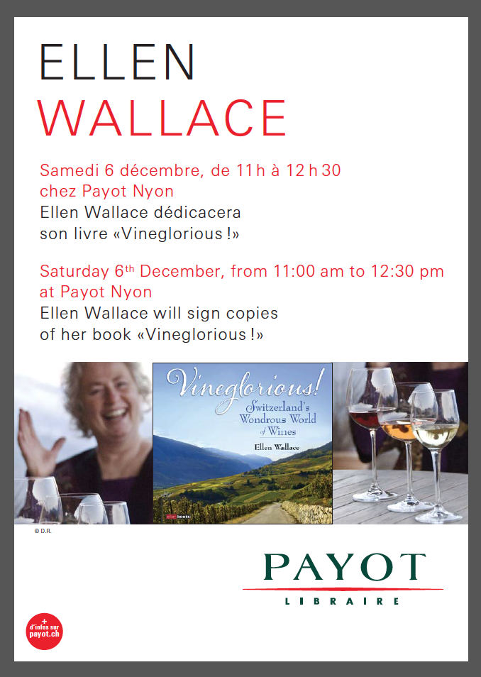 I’ll be signing copies of Vineglorious! Switzerland’s Wondrous World of Books at the Payot bookstore (Migros centre) Saturday 6 December, 11:00-12:30. It’s likely to be the last chance to get signed copies before Christmas, so come along and add a few books to your Christmas shopping bag!