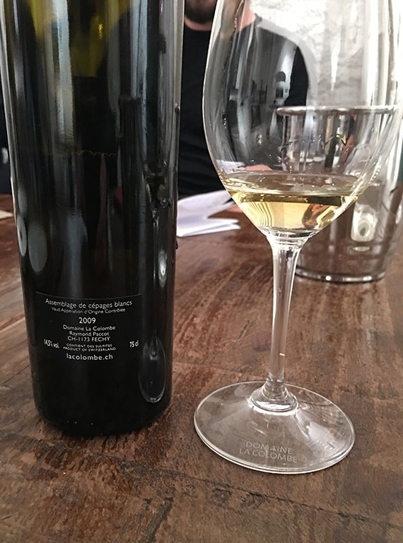 Raymond and Violaine Paccot begin to share details about what’s the same, what’s different, in the way Curzilles is made, year in, year out. We keep sipping, spitting, reflecting, listening, commenting, arguing a bit. I’ve met a couple of these people previously, ardent wine amateurs, plus Dennis Lapuyade, who is the other serious Swiss wine writer in English. Noé Christinat is also at my table, a young winemaker from Ollon who as a student at Changins was a member of the third-place team in a very high-level international dégustation competition held by EHL (Lausanne’s hotel school). He spent some of his student training time working at the Paccot family winery, so his questions and remarks are focusing and informed.