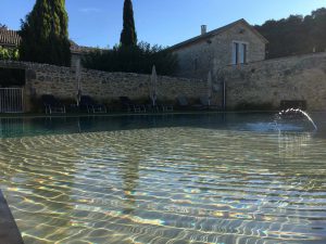 My “room” was a well-equipped and beautifully decorated small apartment for two with a good-sized balcony and views over a scene that has surely changed little since Medieval times. Scents wafted up from the herbal garden planted just below. I almost regretted coming at harvest time, for it was the tail-end of the swimming pool season; I opted instead for a wonderful massage in the spa one afternoon after a trek down to the river so Reto could show me the small waterfall and private beach on a bit of the Cèze river. We drove up to the hilltop on a rough track in his Land Rover; more intrepid souls use horses to reach the spectacular view.