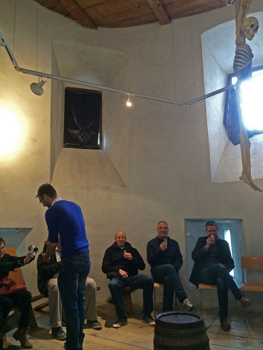 We did have one interesting change of environment, when the group of judges paid a visit to the capital of Valais, Sion, and we sampled a medieval-style wine while sitting in the Witch’s Tower, with a skeleton dangling in the centre of the room.