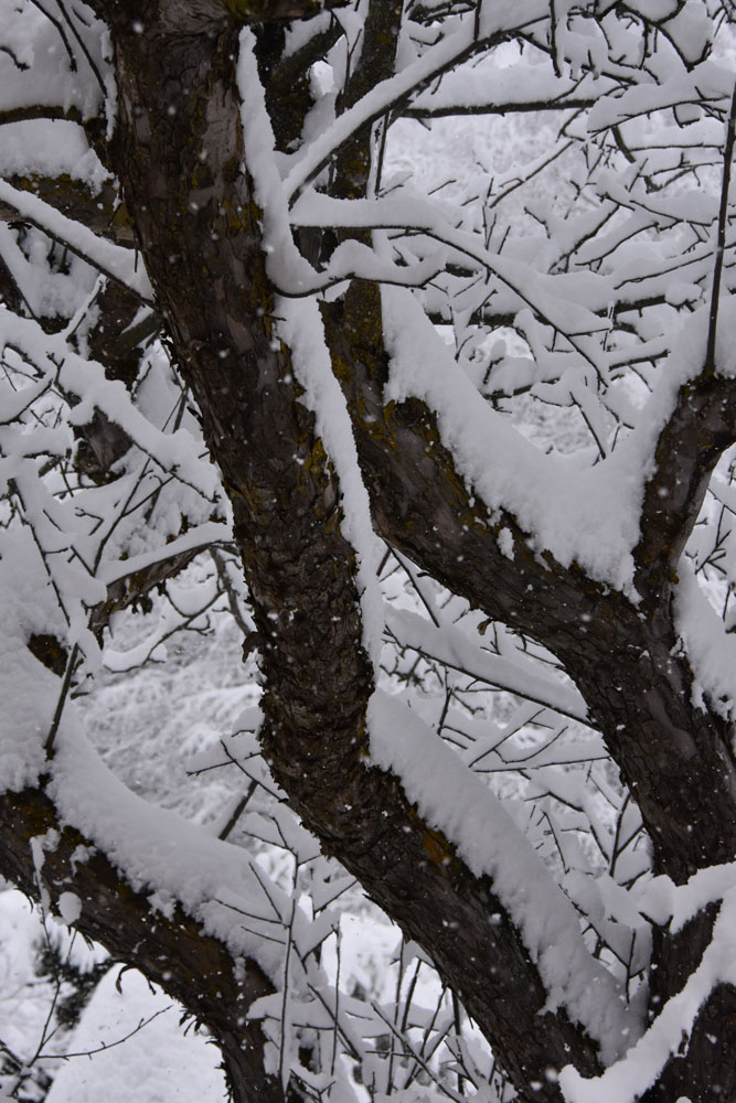 The last day of March we finished pruning the fruit trees and made mulch from the cuttings, with the sun shining, wearing light jackets. Skiers in the family enjoyed the snow until noon, when it turned to soup.