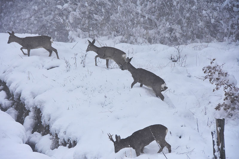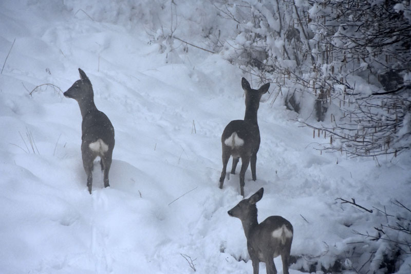 A herd of Swiss red deer slipped through the pasture next door, quietly, as dusk fell, wary until they spotted me. They were extinct at one point and were brought back from Austria; today there are 35,000 of them in the country, mostly shy. Did you know the males grow new antlers every year? More on this beautiful animal (Fr)