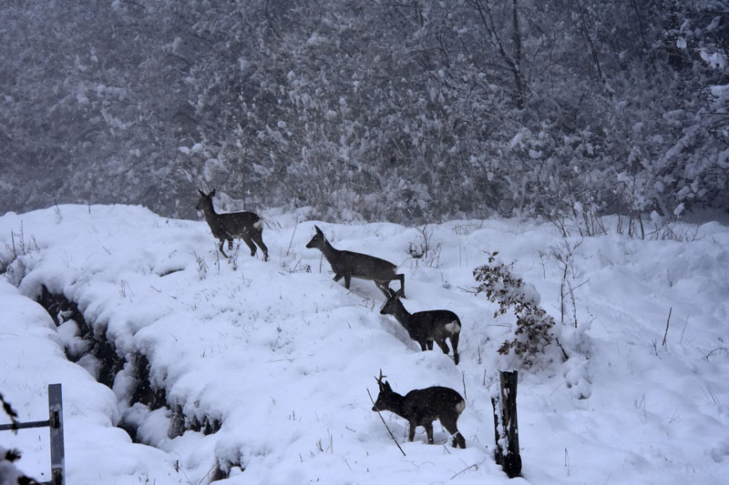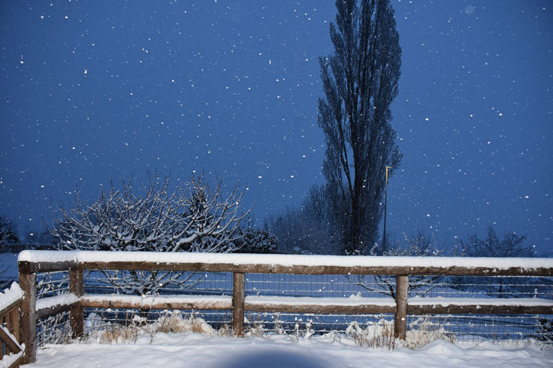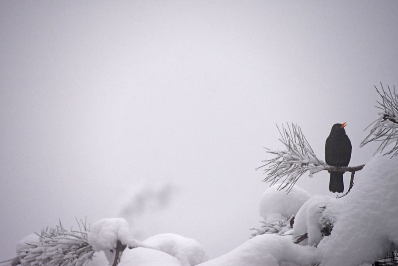 And 4 April we had a sudden shift and 40 cm of snow showed up in Crans-Montana, beautiful in early morning light, but heavy and wet. It carried on all day and the top of the frogs’ pond froze (they hide under the mud deep down). Two blackbirds sang back and forth to each other from the tops of two trees. Blueberries kept their buds tightly shut (good!) as the snow fell on them.