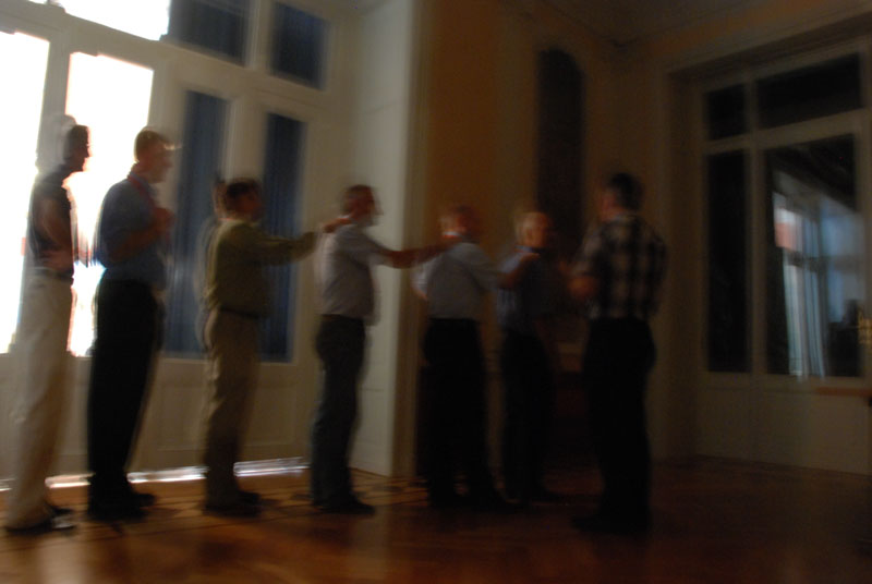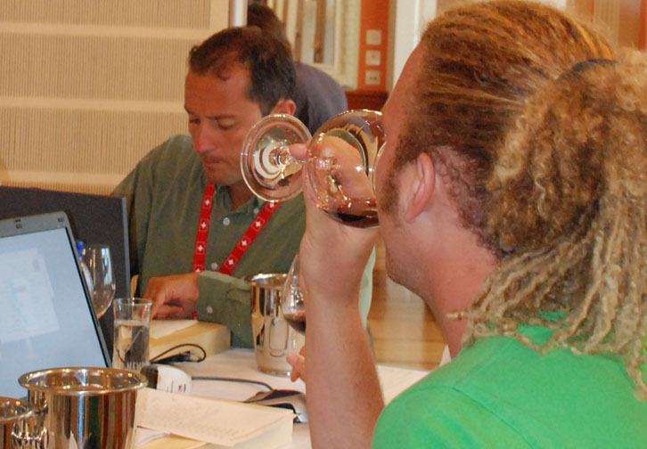 Photo, top: an unusal feature at the Mondial du Pinot Noir this year was a truly blind tasting, with small groups of judges led into a darkened room where they tasted wines without the benefit of seeing them.