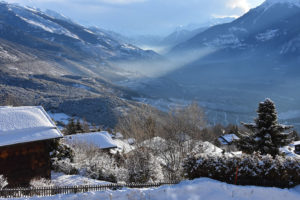 Fresh snow everywhere in the Rhone valley: spotlight on Brig in the distance, Salgesch/Salquenen vineyards closer. 09/02/2019 by Ellen Wallace Leave a Comment