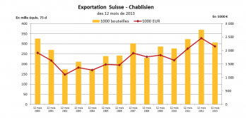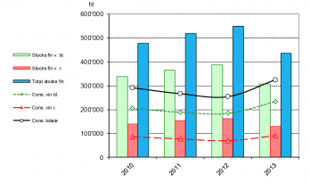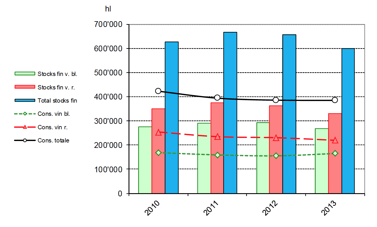 Combing through the figures it appears that stocks in Vaud rose sharply in 2012 – only to fall sharply in 2013. The shift in stocks is nowhere near as marked in Valais, and less marked in Geneva than in Vaud. Since the figures don’t provide pricing information it seems logical to assume that wine stocks fell in Vaud not just because the harvest was proportionally smaller than in Valais (the harvest was smaller in both areas), but because prices fell more significantly. Vaud drank more Swiss white and red wine last year and stocks of both fell sharply. Valais drank more white wine than the previous year, but less red; stocks of both fell more moderately.