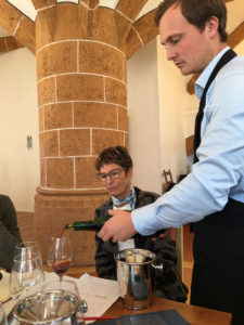 The colour is a startlingly bright red, for a wine this age, but it hasn’t been moved in 60 years. Nose of deep and sharp stewed grapes. Mouth: wow, simply wow. Young, fresh, fruity, still plenty of energy here, no sense that it has really aged. Clavien: “A monument. The mouth is Big! Plums, prunes. Saverot, shaking his head: “It’s powerful, forceful – such energy.” Clavien calls it Valais’s “emblematic wine, a grape that makes no concessions, on the vine and in the cellar.” Harvested very late but we don’t know exactly how it was vinified, how they did it at the time, no notes to tell us. Imhof was very much a man of his era, she adds. Very hard to believe this wine is really 1964; this is a memorable moment.