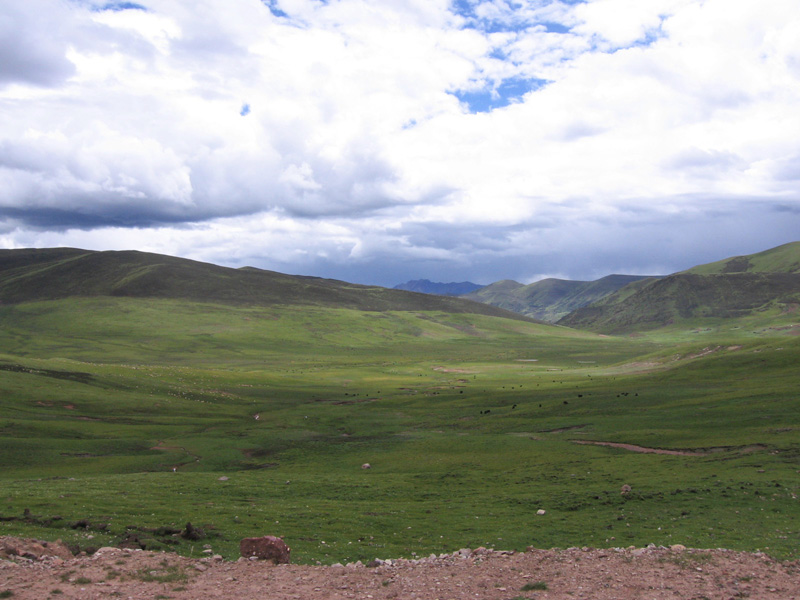 I climbed for several hours in the sun before making it to the top of a ridge overlooking the valley, where I dropped my pack and collapsed onto it. I sat perched on this ridge overlooking the rolling hills of Eastern Tibet. In the distance herds of yak could be seen making their way up steep hills, an army of black dots with the occasional white tail swishing in their midst. Far below me the Tibetan family and horse could be seen on the road, past the checkpoint. Far above me white marshmallow clouds perched in the blue sky, the type that make you hungry just to look at them. Two black dots stood out against the clouds: a pair of eagles that soared gently above me on the currents.