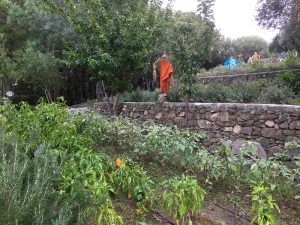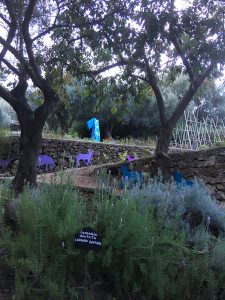 The first was Su Gologone, in the highlands near Oliona, 25 km from the sea, so day trips to the beach are an option. You have to look for the entrance, so discreetly folded into the màcchia is this hotel that began life as a restaurant near a well-known mountain spring, which gradually added a hotel and Sardinian fine crafts and art centre. It’s all the more surprising then, to realize that here are scores of rooms and suites, a multitude of nooks and crannies: a classy and contemporary cactus garden that leads to the breadbaking corner, one of the finest gardens of herbs I have ever seen (watched over by scarecrows in designer fabrics) that will delight anyone who grows these. The red and blue breakfast patio and a pink holy water font corner that is simply funky.