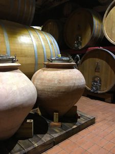 The quiet and dimly lit cellar houses the usual barrels and large wooden vats for wine to mature, and clay amphores and concrete eggs to experiment with new methods are tucked in here. Next door are the stainless steel tanks stacked to receive the grapes dropped from above, then the juices below, slowly, without the use of pumps – minimal handling of the grapes is part of the Antonelli recipe for good wine.