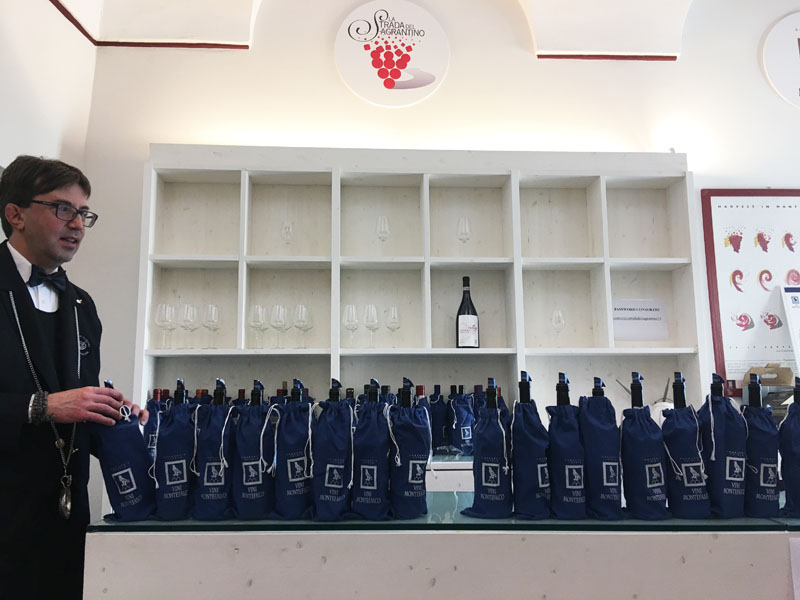 Less threatening was our blind tasting. We began with fruity, medium-weight Montefalco Rosso DOC wines that are blends of Sagrantino (10-25%), Sangiovese (the widespread and famous central Italy grape – 60-80%) and other reds, often Merlot (0-30%). These blends are easier to make and to drink than Sagrantino single grape wines. Starting in 2016 only the local Sagrantino and Sangiovese are allowed by DOC regulations. The wines must by law be aged for 18 months, starting 1 November. Montefalco Rosso DOC Riserva is aged a total of 30 months, of which at least 12 months must be spent in oak, either barrels or large oak vats. Sagrantino is harvested later than other reds, historically late October or even November, although in 2017 the harvest took place much earlier, in September, because of the hot summer.
