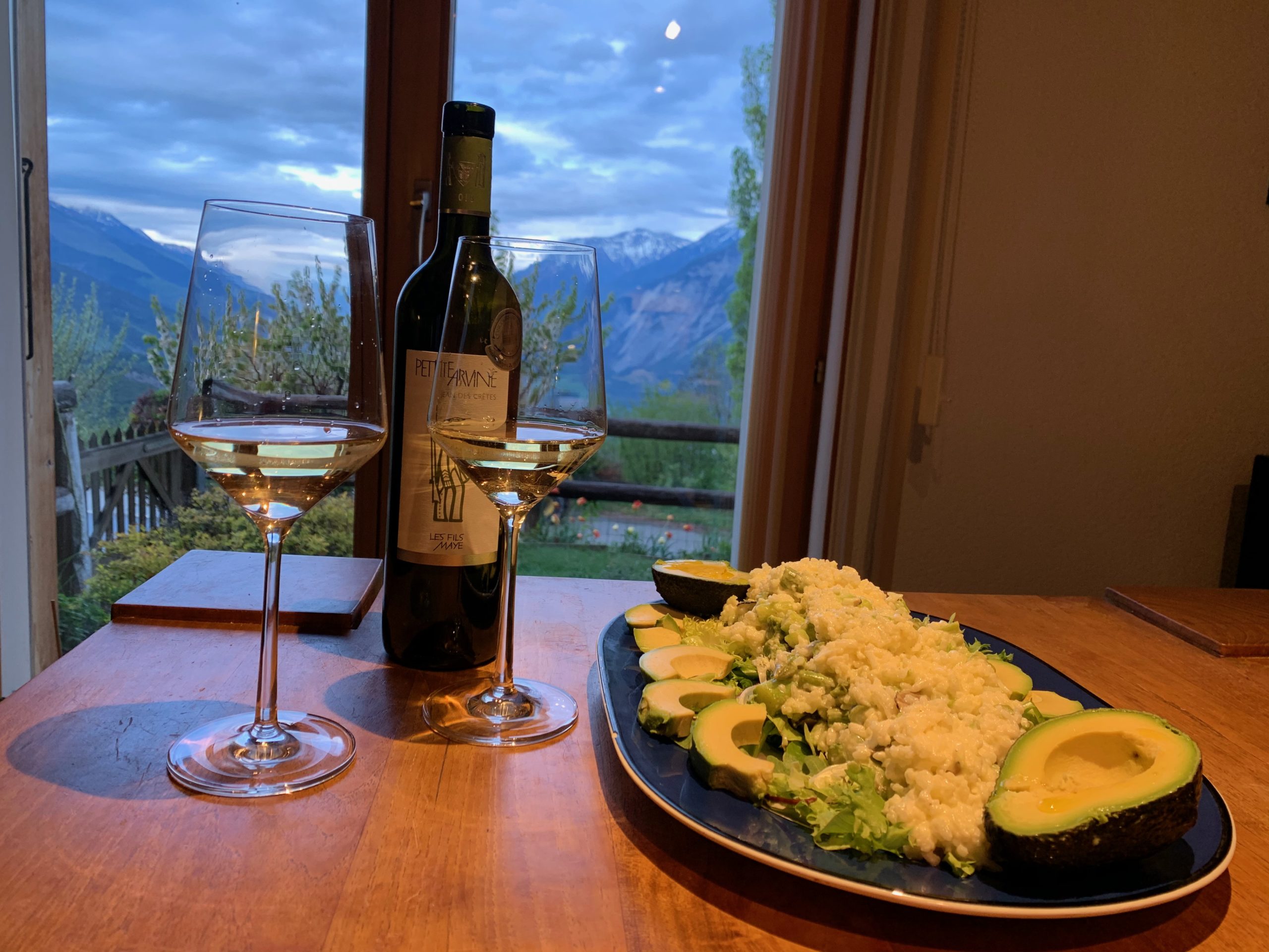 After more than a month of self-isolation a day suddenly arrived where we needed a bit of zing! in the evening. Fortuitously, a trial test to order farmer-to-consumer avocados from Spain turned out very well, the best of these I’ve ever had. And world-class asparagus from Saillon in Valais was suddenly available. Which added up to an accidentally very large rice and asparagus side dish using a recipe from the town of Saillon’s online recipes for les asperges (7.4).