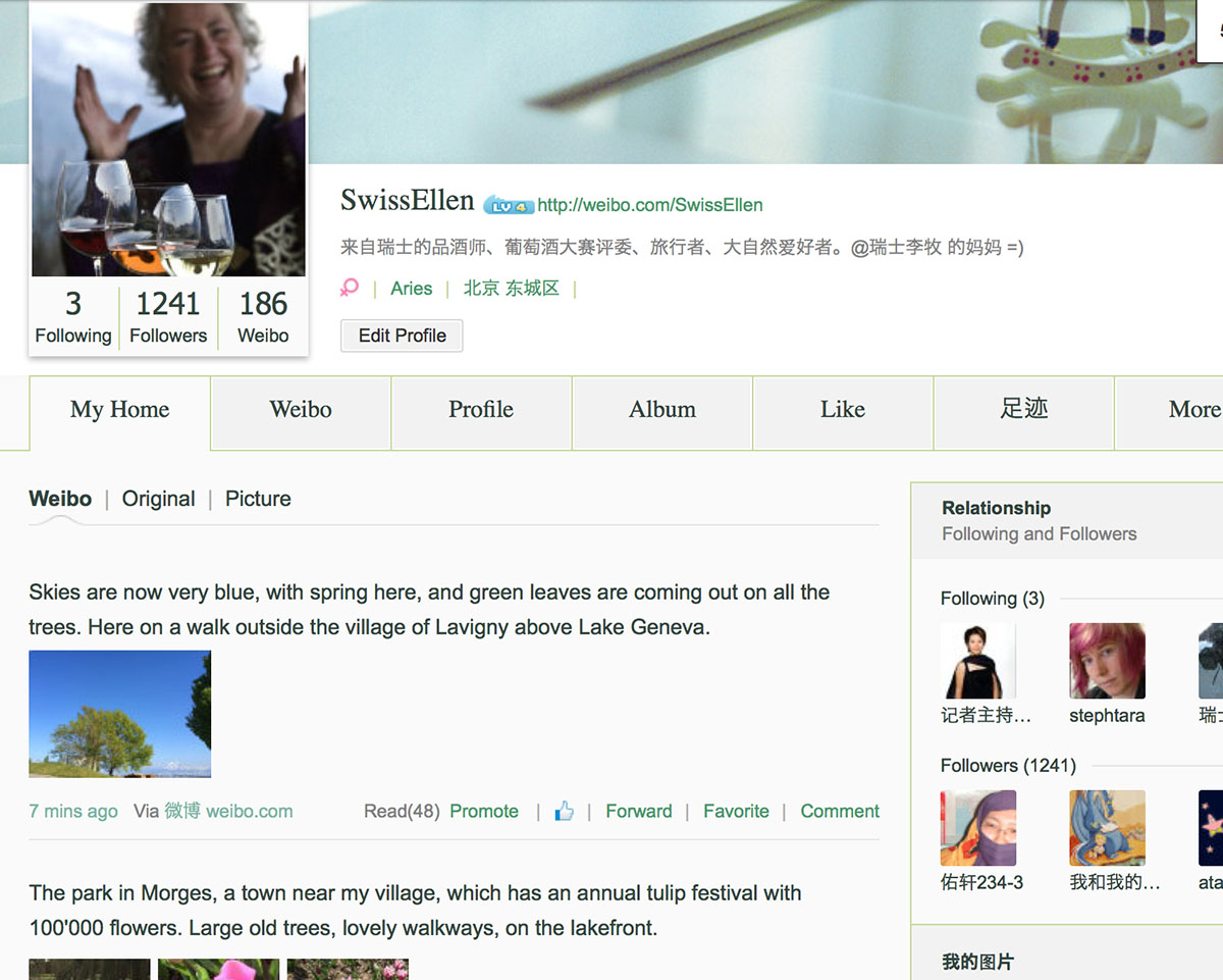 I thought it might be helpful to show you just what Weibo looks like with a screen shot of my page today. I posted that Lavigny, Vaud green tree with blue sky 30 minutes ago and so far it’s been viewed by a couple hundred people.